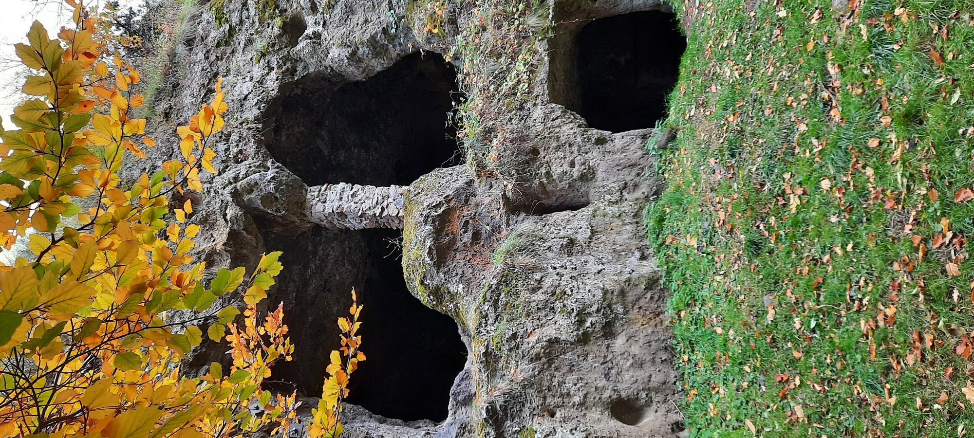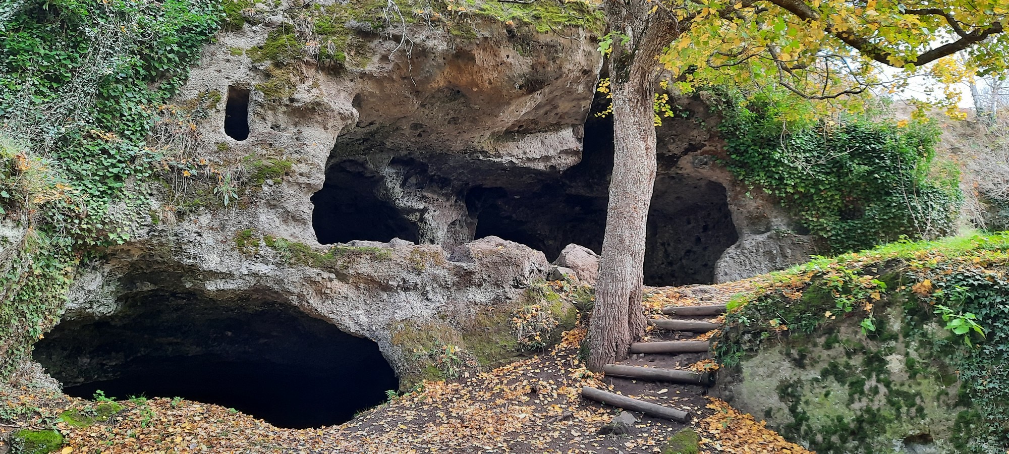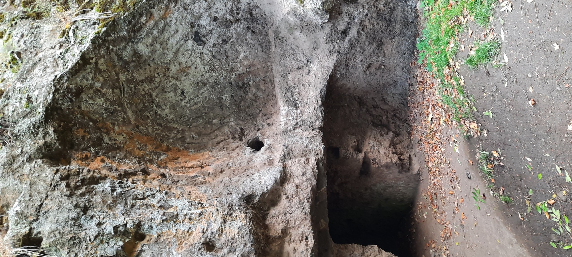 Cet habitat permanent du XIIe au XIVe siècle a été aménagé dans un tuf volcanique contenant de nombreux blocs projetés par les violentes éruptions successives.